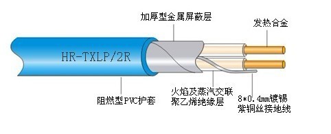 它結構包括有:護套:藍色聚氯乙烯( PVC );   接地線:鍍錫銅絲;   屏蔽層:鋁箔 + 銅絲; 內導體:合金電阻絲+銅絲; 內絕緣:交聯聚乙烯( XLPE );