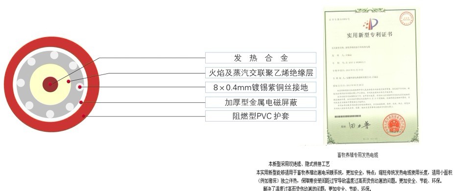 我司提供的一種畜牧養(yǎng)殖幼崽專用發(fā)熱電纜,包括有發(fā)熱合金,所述的發(fā)熱合金外依次包覆有塑料導(dǎo)體、氟隆絕緣層、火焰及蒸汽交聯(lián)聚乙烯絕緣層、鍍錫紫銅絲接地、加厚型金屬電磁屏蔽層、阻燃型PVC外護(hù)套和彈性橡膠軟套,所述的發(fā)熱合金和塑料導(dǎo)體融為一體,防止電打火的情況發(fā)生。